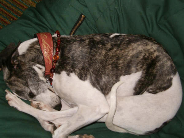 Emily was sold as a 9 week old puppy to a lady who had Deerhounds but wanted something smaller to be her perfect pet. All was well, or so I thought, until I got a call from this lady 7 months later. She wanted me to take this horrible dog back, (which my contract explicitly states). I was told she screamed constantly in her crate, pooped and peed in her crate, and when she was put outside in her kennel, she jumped her 6' fence and would disappear for hours on end. The lady was at her wits end, this has been going on for 7 months!!! We agreed to meet and I got Emily back. She was in good condition, well fed, and just lying on this lady's front seat on a blanket like a royal princess.